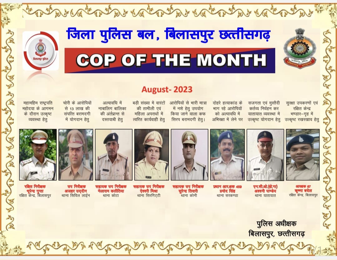 पुलिस अधीक्षक बिलासपुर संतोष सिंह द्वारा पुलिसिंग के क्षेत्र में अच्छा कार्य कर रहे अधिकारी कर्मचारी को प्रोत्साहित करने हेतु प्रति माह ’’कॉप ऑफ द मंथ’’ पुरस्कार दिया जाता है। इस कड़ी में माह अगस्त 2023 में पुलिसिंग के क्षेत्र में अच्छा कार्य करने वाले पुलिस अधिकारी कर्मचारियों को पुलिस अधीक्षक बिलासपुर द्वारा पुलिस अधीक्षक कार्यालय में आज ’’कॉप ऑफ द मंथ’’ सम्मान से सम्मानित किया गया।